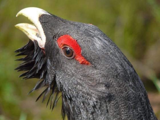 Głowa koguta głuszca. Nad okiem czerwona brew (tzw. korale), która silnie nabrzmiewa w okresie toków. Fot. Archiwum Nadleśnictwa Janów Lub.